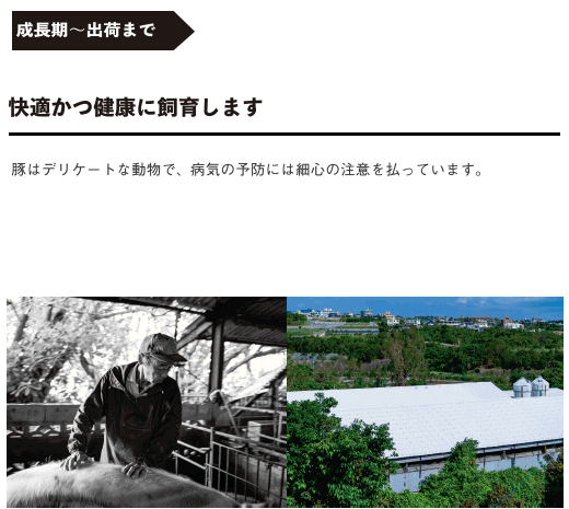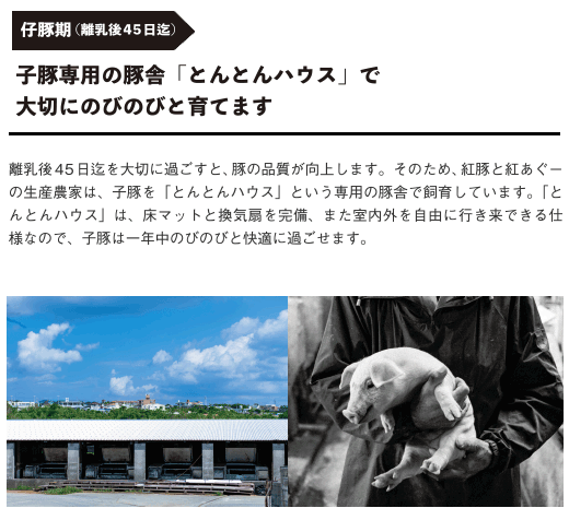 たとえば、発酵飼料を含む独自の配合飼料や、新鮮な空気と適切な室温に配慮した豚舎など、